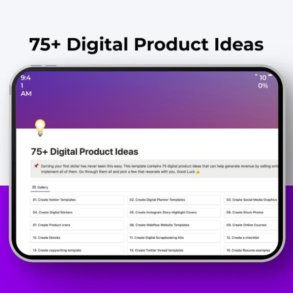 Earning your first dollar has never been this easy. This template contains 75 digital product ideas that can help you generate revenue by selling online. Do not try to implement all of them. Go through them all and pick a few that resonate with you.